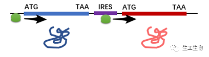 IRES全名为内部核糖体进入位点,在一些病毒和部分真核基因结构中存在,它的存在能够使蛋白质翻译起始不依赖于5‘帽子结构,从而使直接从mRNA的中间起始翻译。将IRES构建到两个基因中间,这样第一个蛋白靠5’帽子结构起始翻译,而第二个蛋白则依靠IRES起始翻译。