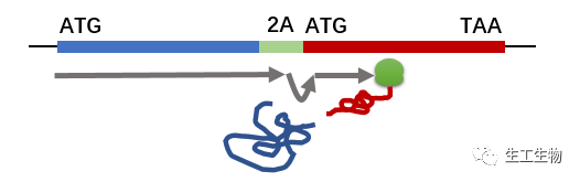 2A是仅存在与病毒中的一段基因元件,最早发现于口蹄疫病毒,大家都知道,病毒的基因组是非常小的,可谓寸土寸金,必须要找到一个最简约的方案来表达它需要的蛋白。于是,病毒进化出了2A,2A的肽段仅包含18~22个氨基酸,不同来源的2A在C端具有高度保守性,为-D-(V/I)-E-X-N-P-G-//-P。X为任意氨基酸,//为切割或跳跃位点。它能阻止翻译过程中氨基酸形成共价键,并维持翻译继续进行,发生的位置在倒数第二位Gly和最后一位Pro之间。这个过程被形象地称为“核糖体跳跃”(也有称为“顺式水解反应”),即核糖体从编码Gly的密码子跳跃至编码Pro的密码子而中间没有肽键形成,从而“断裂”为两个独立的蛋白。