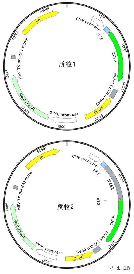 区别在与egfp基因之前是否含有IRES序列,这直接导致了其功能上的不同,质粒1由于没有IRES,因此它主要用于目的基因与egfp的融合表达,可以用于对目的蛋白进行示踪。质粒2中的egfp基因前面含有IRES序列,使得插入的基因与egfp能够独立的进行表达,EGFP的作用主要是考察质粒的转染效率而不会对目的蛋白产生任何影响。