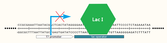 lac I基因是乳糖操纵子的一部分,它的表达产物为lac阻遏物,该阻遏物能够跟lac operator操纵区域结合,与启动子的末端发生重叠。这种结合阻碍了RNA聚合酶与启动子的结合与向下转录,使得下游基因的表达关闭。因此Lac I蛋白可以作为lac operator上游启动子的开关。当添加诱导剂IPTG(一种乳糖类似物,能够与Lac I蛋白结合使其构象变化,从lac operator上解离下来)之后,启动子重新开启表达。