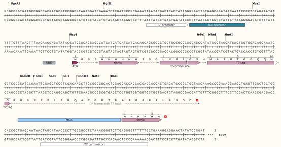 上图为pET-28a的核心表达区,主要组成部件有T7 promoter & terminator、lac operator、6×His、Thrombin site、T7 tag以及MCS区域。下面将分别介绍几个元件的功能。(想要做出上面这样酷炫的序列图?度娘snapgene或持续关注生工生物微信号对于该软件的安利)