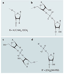 核酸适配体在体内极易被核酸酶降解而表现出极大的不稳定性,因此需要对它进行修饰提供稳定性和抗降解能力。在核酸适配体的糖环上可以进行 2′-F, 2′-OCH3,2′-NH2修饰,在核酸骨架上可以进行硫代修饰,在核酸适配体的3’,末端可以进行inverted dT修饰。