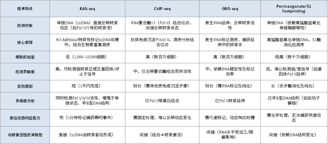 KAS-seq通过化学标记与高通量测序的巧妙结合,首次实现了低样本量、高灵敏度、全基因组的ssDNA检测,为转录动态与增强子功能研究提供了“金标准”。其技术创新性不仅体现在方法学突破,更在于揭示了转录调控中“结构-功能”的深层关联——单链DNA不仅是转录的副产物,更是基因表达调控的主动参与者。
