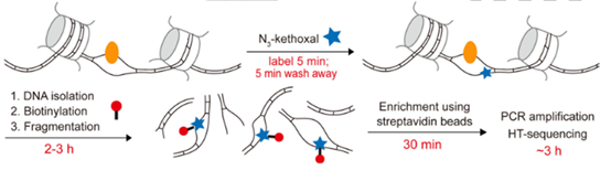 1) 标记与富集:N₃-kethoxal标记后,通过生物素-链霉亲和素磁珠富集ssDNA片段,结合高通量测序实现全基因组单链区域定位。