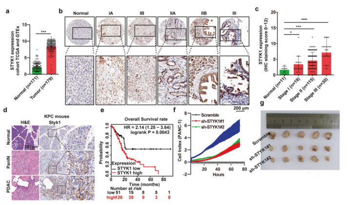 首先研究团队通过转录组测序发现STYK1在多种人类癌症中普遍高表达,在胰腺癌中尤为显著。通过对多个公共数据库,患者胰腺癌组织微阵列,PDAC模型小鼠进一步分析,表明STYK1的表达水平与PDAC(胰腺导管腺癌)的进展平行阶段性增强。在小鼠肿瘤异种移植瘤模型中敲除STYK1后,肿瘤生长相较于对照组明显减弱。