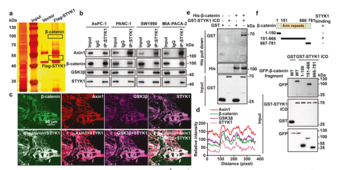 为了进一步探讨STYK1在调控Wnt/β-catenin信号通路中的机制,作者构建表达STYK1相关蛋白复合物进行亲和纯化。随后通过LC-MS/MS分析,鉴定出GSK3β和β-catenin为主要相互作用蛋白,表明STYK1通过调节β-catenin降解复合体的活性参与Wnt/β-catenin信号通路的调控。通过CO-IP,免疫荧光,GST-pull down等多重验证,结果均表明STYK1和GSK3β、β-catenin有相互作用。CHX追踪实验表明STYK1过表达显著抑制β-catenin的降解。