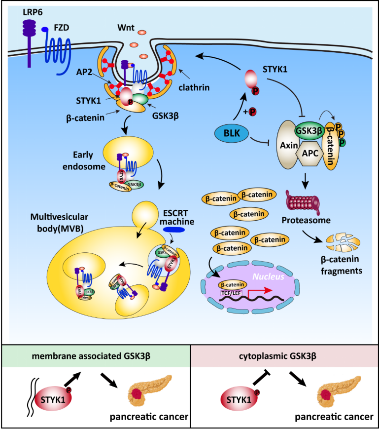 在本研究中,作者发现了一个重要的靶标STYK1,并探究了STYK1在调控经典Wnt/β-catenin信号通路及胰腺癌肿瘤发生中的作用。研究结果表明,STYK1可直接与β-catenin和GSK3β结合,抑制GSK3β的活性,并促进其进入多囊泡体(MVBs)中。BLK激酶对STYK1的Y191位点磷酸化,增强其与AP2的相互作用,从而加速GSK3β隔离至MBVs,使其失去对β-catenin的抑制作用,并随后激活Wnt/β-catenin通路。这些结果共同揭示了在胰腺癌中一种由STYK1驱动的Wnt/β-catenin激活的新机制,并为将STYK1介导的信号转导作为治疗策略提供了临床前证据。