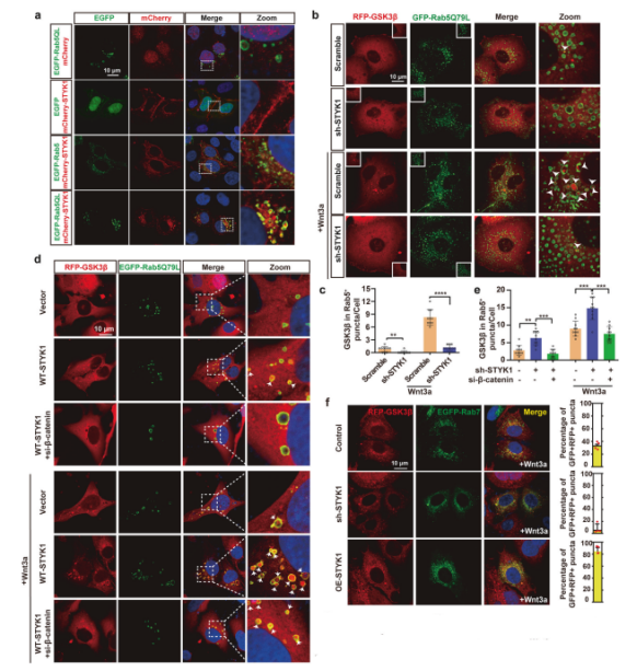 接下里,作者进一步研究STYK1和GSK3β、β-catenin之间的作用机理。先前的研究发现,STYK1 部分定位于细胞膜,胞内部分则与 Rab5 或 Rab7 阳性(Rab5⁺/Rab7⁺)多囊泡体(MVBs)共定位,而这些MVBs与 GSK3β 的隔离有关。因此,作者猜测STYK1会影响MVBs对GSK3β 的隔离。因此,作者构建了一个Rab5 Q79L突变体以诱导形成扩大的晚期内体囊腔,并分析了Rab5 Q79L表达细胞中GSK3β的亚细胞分布。结果表明,Wnt3a会显著促进GSK3β进入MVBs中,而STYK1的缺失会逆转这一过程。