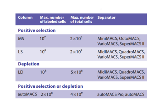 确认分选柱:对于不同类型的分选柱选择,关键是不要超过推荐的细胞量,否则会使柱子过载,导致分选效果不佳。可根据您的细胞总数和目标细胞数、分选策略选择对应的分选柱,可参考下图。对于具体使用的磁珠,参考每个磁珠说明书附的数据表,进行分选柱的选择。