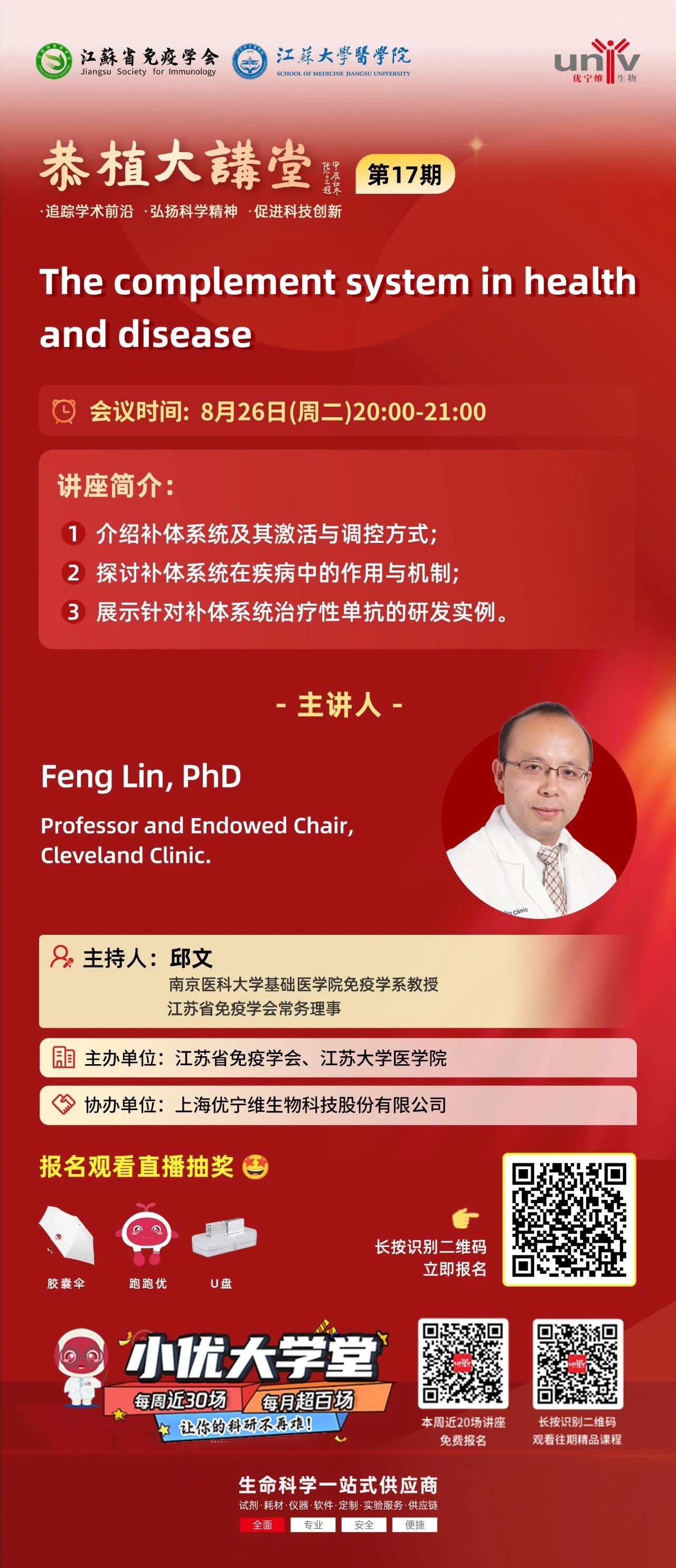 恭植大讲堂·17期将于8月26日20:00开讲。本期主讲嘉宾:Feng Lin, PhD. Professor and Endowed Chair, Cleveland Clinic. 为大家带来有关《The complement system in health and disease》的主题分享干货。报名观看直播还可以参加抽奖,领取u盘、跑跑优、胶囊伞等好礼。