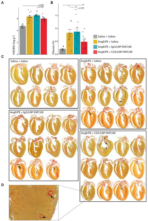 4、中心室纤维化百分比的量化显示,仅在CD5/LNP-FAPCAR治疗的动物中,纤维化得到缓解。