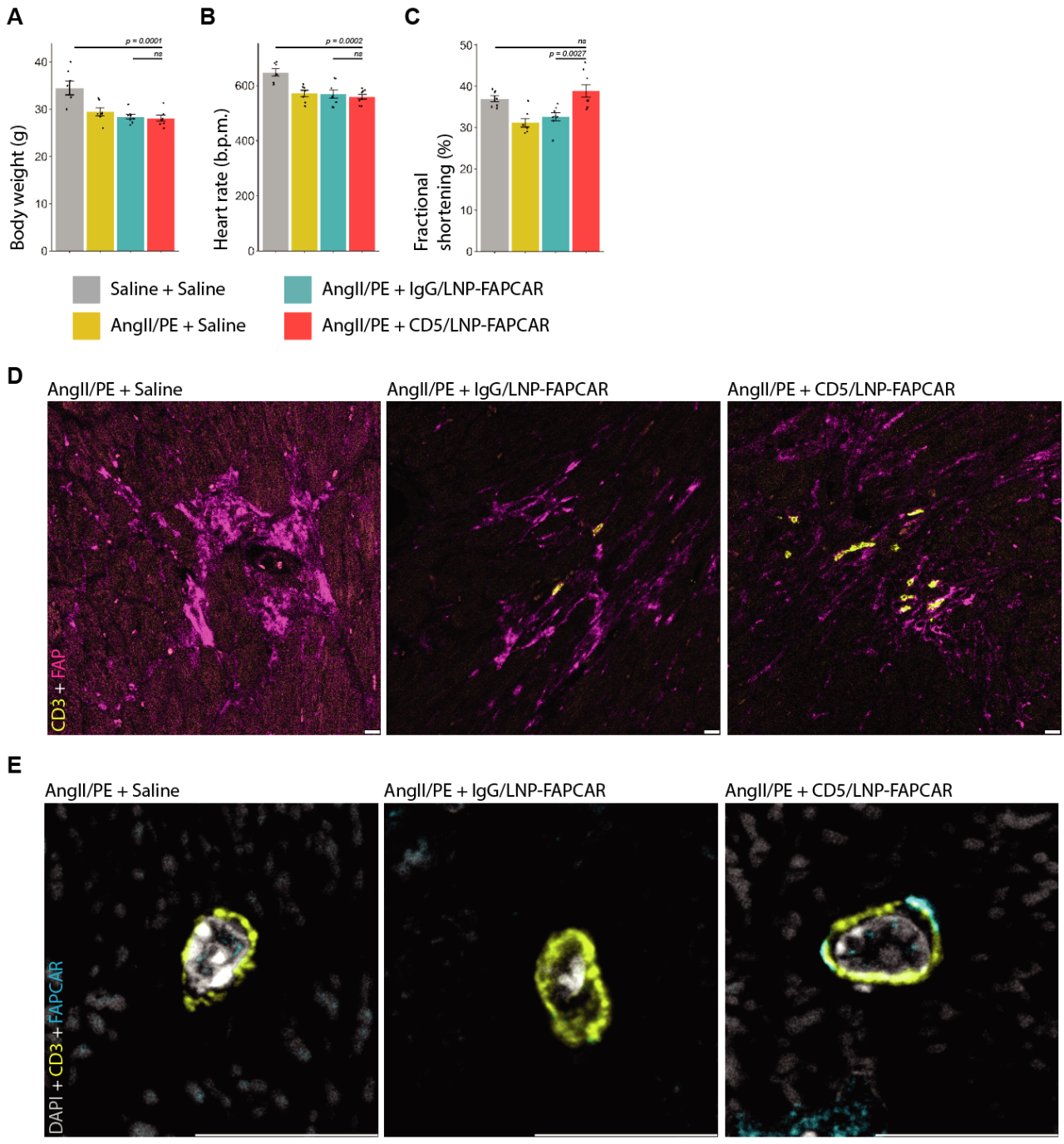 3、 心脏重量与体重之比(HW/BW,mg/g)在AngII/PE损伤后增加,并在CD5/LNPFACPAR治疗后部分缓解。