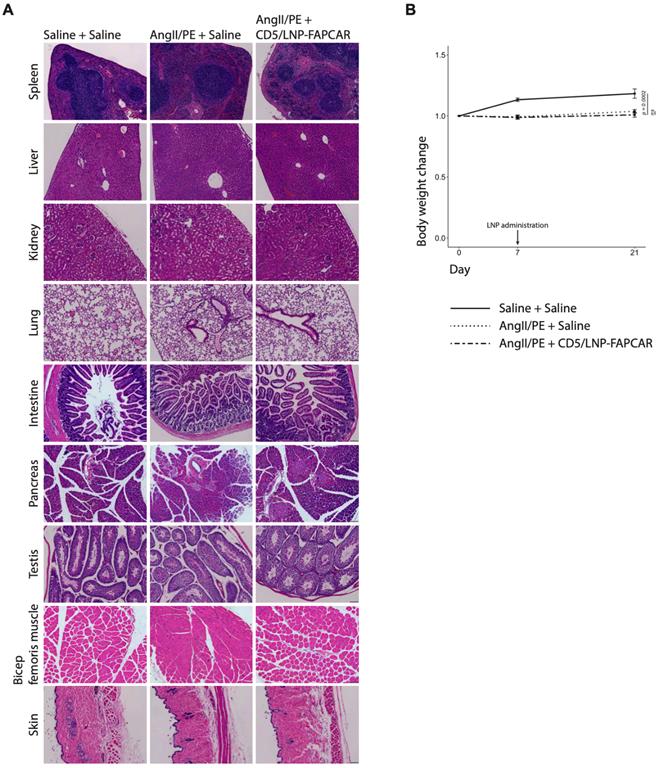 超负荷损伤三周后,经CD5/LNP-FAPCAR治疗的ANGI/PE损伤动物的体重没有下降。