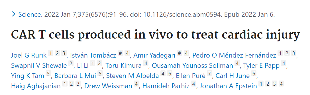 一篇发布于Science的手稿详细叙述了用于治疗心脏损伤的体内产生CAR T细胞制备及效果的分析。