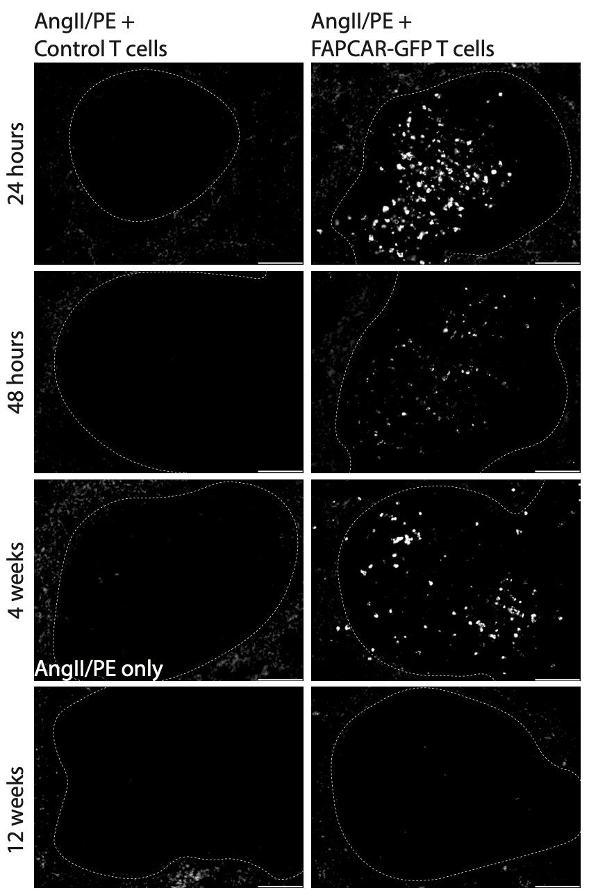 FAPCAR T细胞从活化的心脏成纤维细胞中转胞糖化FAP,并仅在AngII/PE损伤、FAPCAR治疗的动物中将FAP返回脾脏。