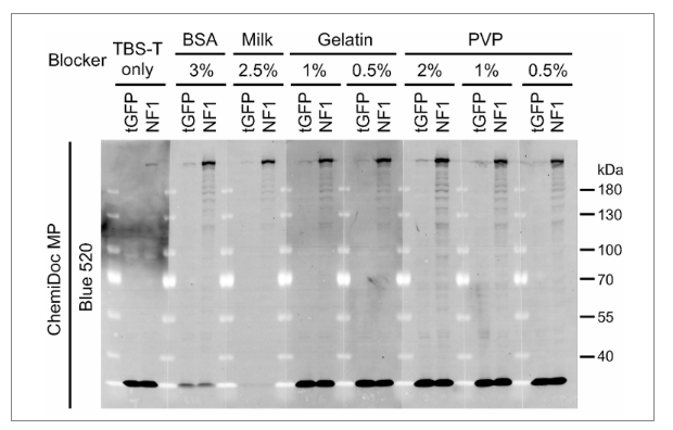 牛奶是非常容易获取且封闭效果好的封闭液,5%的浓度较为合适。也可根据使用的二抗和成像系统匹配的其它合适的封闭液,例如BSA、intercept。