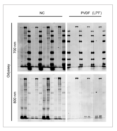而在使用Odyssey 700nm和800nm这两个通道时,低荧光PVDF膜(LFP)的背景也明显低于NC膜。