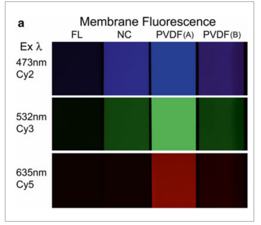 图1 低荧光PVDF膜有低背景(Ex: 473/532/635nm)