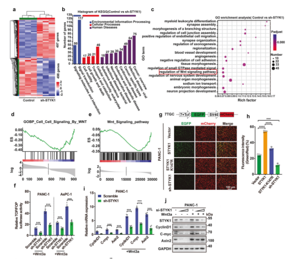 为了深入阐明STYK1在胰腺癌肿瘤发生中的分子机制,作者对稳定转染STYK1 shRNA的胰腺癌细胞进行全基因组RNA测序。基因本体(Gene Ontology)富集分析显示,STYK1的缺失会改变Wnt/β-catenin信号通路的调控,而这一通路被认为与胰腺癌的进展密切相关。在AsPC-1和PANC-1这两种胰腺导管腺癌(PDAC)模型中,TOPflash/FOPflash双荧光素酶报告实验显示,STYK1缺失可显著抑制β-catenin的基础转录活性以及Wnt3a刺激所诱导的转录激活。而STYK1过表达可增强β-catenin在核内的积累。这些结果表明,STYK1通过调节Wnt/β-catenin信号通路进而调节胰腺癌进展。