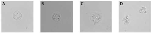 B:细胞核完整,有少量起泡迹象。仍然可进行后续实验。