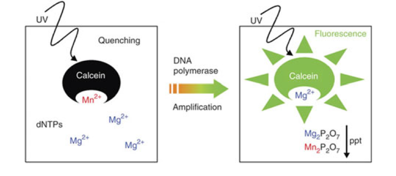钙黄绿素本身是一个能发荧光的物质,当Mn2+存在时,会抑制钙黄绿素发出的荧光,因而初始体系中,是不发荧光或者微弱荧光。而当Lamp 反应时,会产生焦磷酸根离子,焦磷酸根离子就会和钙黄绿素竞争Mn2+,从而产生焦磷酸锰沉淀。钙黄绿素脱离Mn2+抑制后,便与体系中Mg2+ 结合,从而发出荧光。