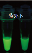 反应管在自然光下由橙色变成黄绿色,对照管不变;在紫外下,能看到强烈荧光,对照管有微弱荧光。