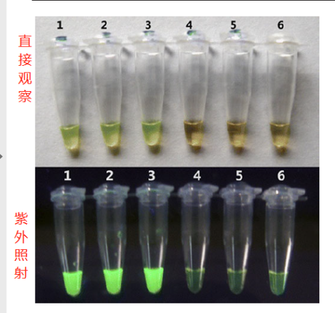 扩增结束后,反应管呈现黄绿色,阴性对照呈现橘黄色,在紫外条件下反应管能看到明显的荧光,对照管比较微弱(上图1-3为反应管,4-6为阴性对照)