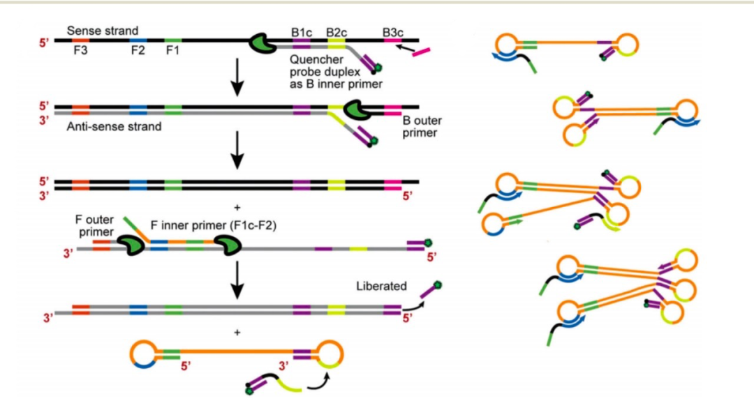 DARQLAMP利用分子拉链设计,该方法利用与一个淬灭内引物杂交形成双链体的探针,一旦聚合酶遇到双链体,探针就会被置换并产生荧光信号。利用这种双链体靶向内引物代替环引物,该方法可用于四引物和六引物LAMP系统[4]。