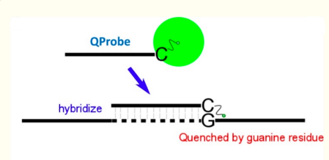 众所周知,G碱基对荧光有淬灭作用,该探针就是利用这个特性,设计时使得3端最后一个碱基为C,然后在这个C碱基上修饰一个荧光集团,当探针与模板结合时,荧光集团与G碱基距离拉近,从而达到淬灭效果(如下图)。