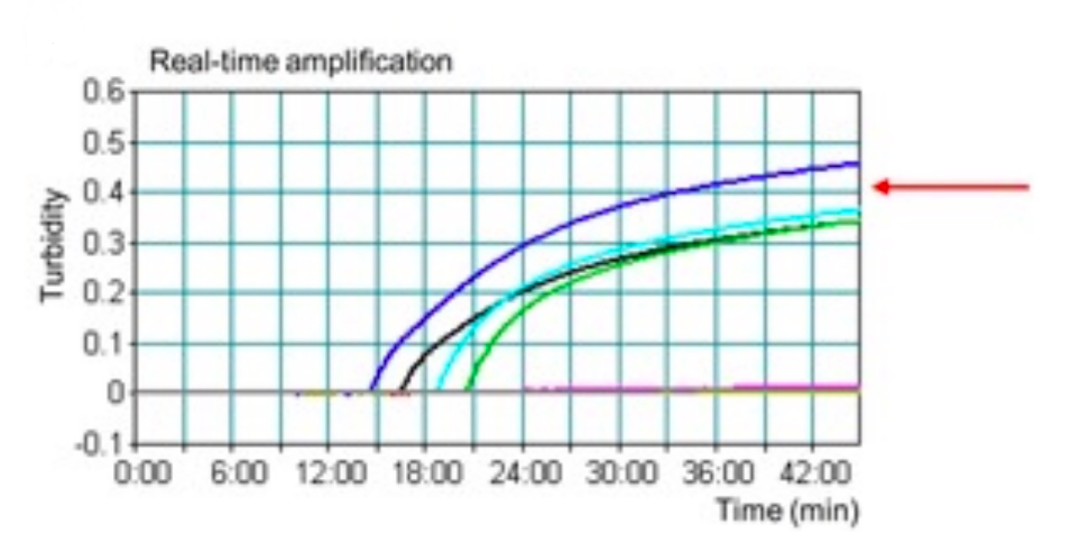 通过浊度仪检测,能实时监控反应过程。浊度仪检测是通过检测沉淀物的生成,从而达到实时检测的目的,但是非特异性扩增及二聚体产生也会导致沉淀物的变化,最终导致浊度检测出现偏差[1]。