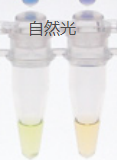 荧光染料(如SYBR Green I)遇到DNA 双链,就会与DNA 双链的小沟相结合,从而发出强烈荧光。在Lamp 反应过程中,不断有产物生成,荧光强度随着产物增加而增加。在自然光下,有扩增一般由橙色变为黄绿色,在UV条件下,能看到强烈荧光。也可以用能记录荧光的仪器(例如荧光定量仪)来进行这个实验,仪器会把荧光增量记录下来,从而实现实时检测。