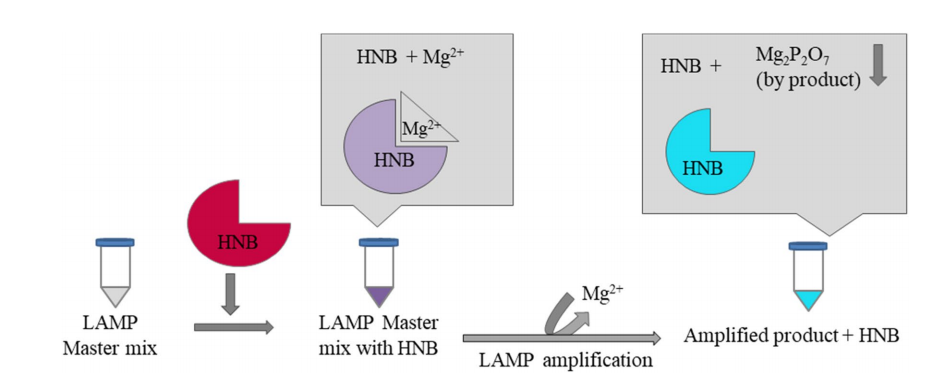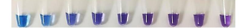 HNB与镁离子结合使得反应体系初始颜色为紫罗兰色,随着反应的进行,Mg2+与析出的焦磷酸根离子反应生成焦磷酸镁沉淀,羟基萘酚蓝失去了镁离子,使得体系颜色变为天蓝色,而未反应的体系则仍保持着紫罗兰色。