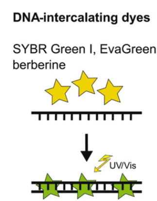 比色法是通过添加荧光染料(例如SYBR Green I、EvaGreen和小檗碱等)或者一些荧光指示剂(例如钙黄绿素、羟基萘酚蓝等)来判断。
