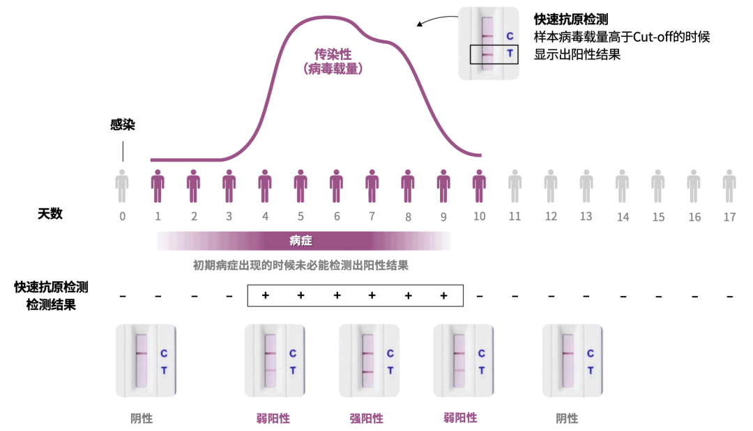 如上图所示,使用新冠抗原检测试剂自测是否会检测出阳性,对于具体的受检者而言,除了是否受到感染,还需要考虑新冠的病程变化。在病毒载量较低的感染初期,抗原检测未必能检测出阳性。另外,自测时没有按照说明书进行操作,比如采样不规范也有可能导致收集的样本病毒载量低导致假阴性。所以抗原检测阴性也不能完全排除受检者个体处于感染状态。