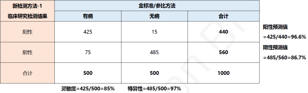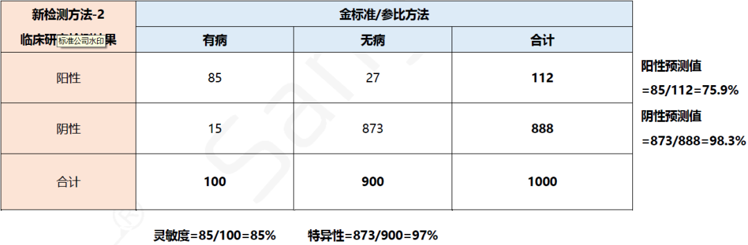 临床研究的人群入排设置或者阴、阳性样本比例会影响对检测结果的判断。假设了两个方法的临床研究结果,结果如下图: