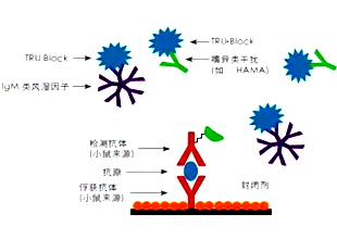 在诊断检测中,HA可以结合多种类型的无关抗原,从而干扰抗原-抗体的特异性结合反应。人抗小鼠抗体(HAMA)的干扰是HA干扰的一种类型,它可以特异性的结合小鼠抗体。因为小鼠单克隆在免疫检测的商业诊断中应用非常广泛,所以HAMA的干扰经常会遇到。例如人自身抗体类风湿因子(RF),可以与人自身的免疫球蛋白(IG)结合,同时也可以与动物免疫球蛋白交叉反应,可引起与HA/HAMA干扰类似的RF干扰。