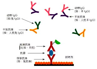 常见的能引起双抗体夹心检测抗原和竞争法检测偏差的主要是异嗜性抗体(HA)的干扰,HA是一类结合力弱的天然抗体,可与来自不同物种的免疫球蛋白反应,这些物种包括小鼠,山羊,兔子,绵羊和鸡。