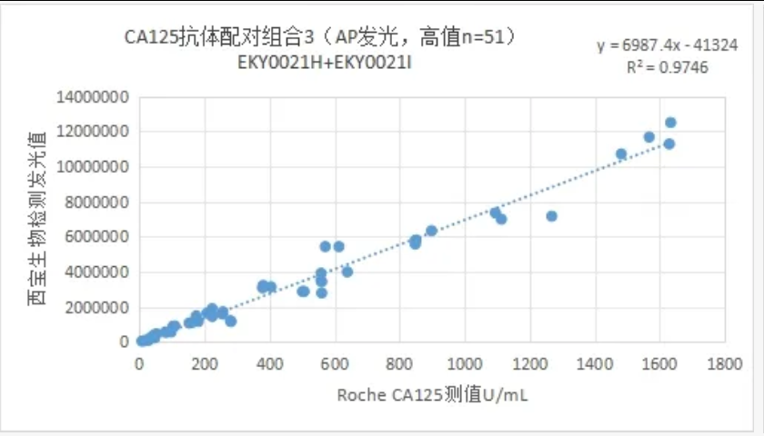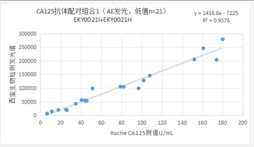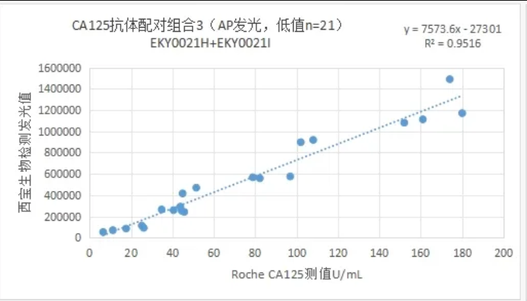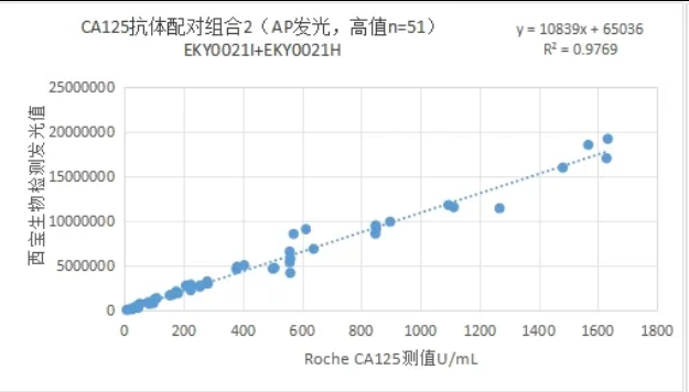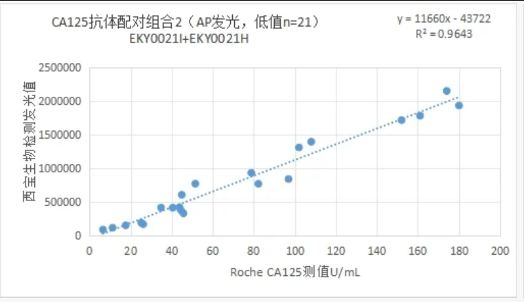 抗体配对组合2:CA125抗体(货号:EKY0021I)包被羧基磁珠+CA125抗体(货号:EKY0021H)标记碱性磷酸酶;