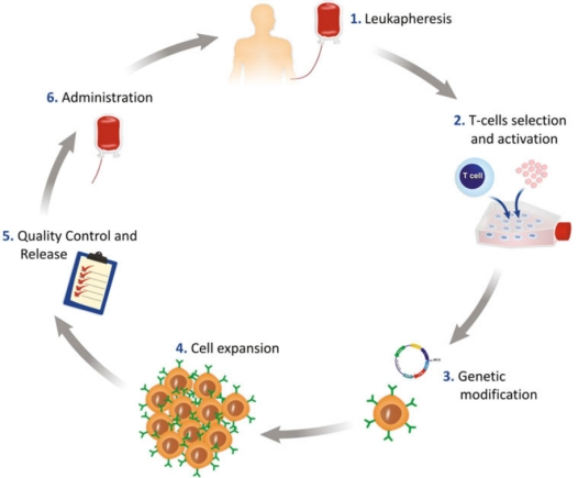 CAR-T细胞治疗全流程,包括采集病患或者健康供体的外周血单核细胞(PBMC)、T细胞分离激活,T细胞体外基因修饰,CAR-T细胞体外扩增,CAR-T细胞质量监控,CAR-T细胞回输病患体内这些主要步骤。