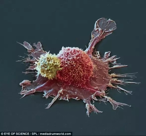 CAR-T细胞(黄色)正在攻击乳腺癌细胞(粉色)