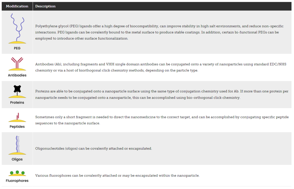 将纳米颗粒用于药物输送应用不仅需要选择合适的粒度、形状和材料类型,还需要选择合适的表面化学成分和靶向配体。在NanoComposix公司,我们可以用特定的功能基团、生物相容性聚合物和生物大分子(蛋白质、抗体、寡核苷酸)修饰许多纳米颗粒的表面。下表总结了NanoComposix公司在药物递送应用中最常用的一些表面修饰方法。