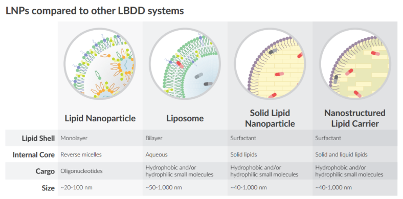 脂质纳米颗粒(Lipid nanoparticles,LNPs)是脂质载体给药系统中的重要技术之一,已成为基于寡核苷酸治疗药物的一个重要进展。封装在脂质纳米颗粒中的寡核苷酸在传递过程中受到保护,不受酶降解,并有效地传递到细胞中,在细胞中载体颗粒中的内容物被释放并被翻译为治疗蛋白。鉴于LNPs对基于寡核苷酸的治疗具有巨大的革命性潜力,新一波研究人员正在追求基于LNPs更有针对性的应用。