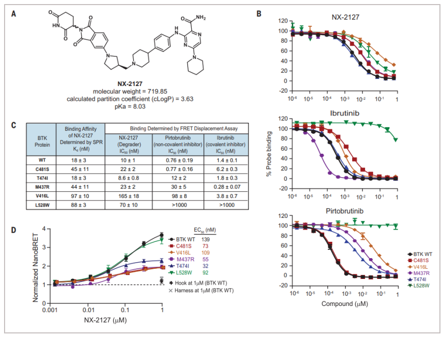 鉴于BTK共价和非共价耐药突变不依赖于激酶活性,作者下一步研究了一种BTK消除而不是酶抑制突变的方法。经过筛选及基于结构的药物设计,药物化学优化,体外和体内经验测试,最终确定有效的,选择性的,口服生物可利用的BTK degrader,NX-2127 A。这种异双功能分子可以有效地参与细胞内泛素-蛋白酶体系统,同时结合BTK和CRBN E3泛素连接酶复合物,诱导BTK、IKZF1和IKZF3的多泛素化和蛋白酶体依赖性降解。接下来,使用基于FRET的探针位移测定法来测量伊鲁替尼、匹托鲁替尼和NX-2127与全长重组BTK WT和突变体蛋白的结合亲和力。发现BTK L528W突变对伊鲁替尼和匹托鲁替尼都产生耐药性,尽管与BTK抑制剂相比,NX-2127与WT BTK的结合亲和力相对较弱,但它能结合所有复发性耐药BTK B-C。使用纳米生物发光共振能量转移(NanoBRET)实验来证实NX-2127在细胞中诱导CRBN和BTK WT或突变体之间形成剂量依赖的三元复合物D