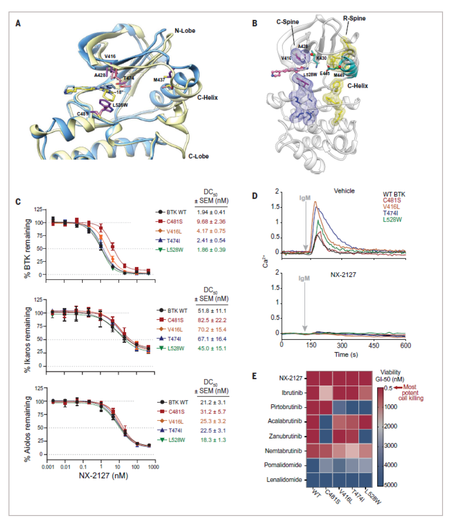 接下来,作者试图确定BTK L528W催化活性降低以及NX-2127与突变体BTK结合维持的结构基础,生成了BTK WT和L528W突变激酶结构域结合到NX-2127的hook部分(黄色代表BTK WT,蓝色代表BTK L528)A。NX-2127 hook的结合姿态显示配体与突变的T474、C481和M437残基之间有很大的空白空间,它们彼此距离相当远,潜在地解释了为什么结合亲和力NX-2127基本上不受这些残基突变的影响。其它突变V416L,A428D和L528W发生在BTK的酶活位点,在L528W突变体结构中,NX-2127与配体的结合同WT结构中观察到的相似。接下来检测NX-2127介导BTK WT和突变体降解的能力,发现是剂量依赖型的C上,另NX-2127也分别促进了IKZF1和IKZF3在BTK WT和突变体中的降解C中和下。为了评估NX-2127处理对下游信号传导的影响,又进行了Ca2+通量测定,发现信号完全消失D。最后,为了评估NX-2127治疗对恶性B细胞存活的影响,作者量化了使用NX-2127、BTK抑制剂和免疫调节药物治疗的WT和BTK突变细胞的活力,发现经过NX-2127治疗后,所有类型BTK(包括WT和各种突变型)细胞均显示有效的抗增殖活性,而其它处理只相应的表现出部分类型的抗增殖活性E