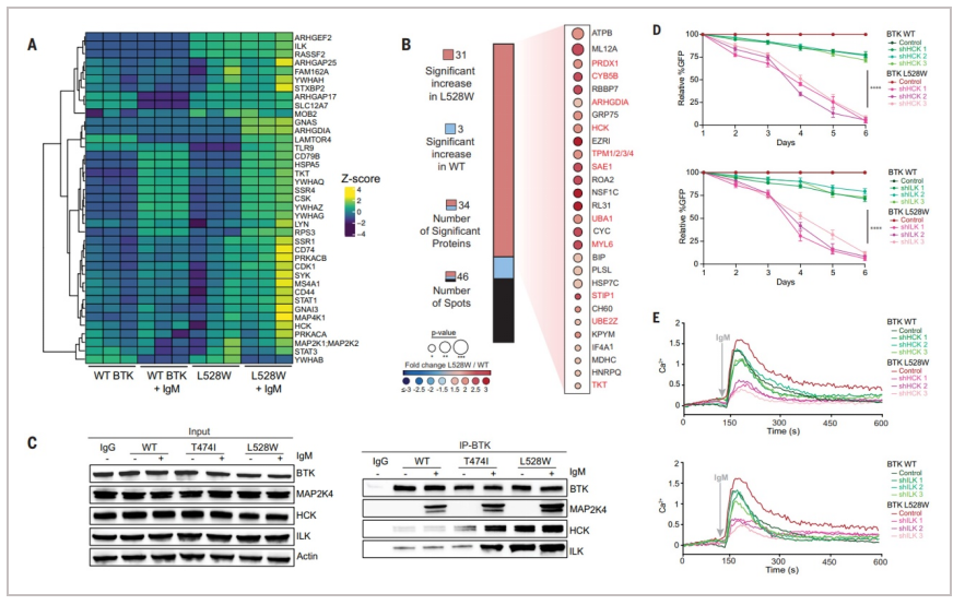 鉴于突变体BTK下游的BCR信号持续存在,无论可观察到的酶活性水平如何,我们假设BTK存在一种新的支架功能。通过质谱方法进行了BTK WT和L528W突变体互作蛋白的鉴定。发现发现,与WT BTK相比,在存在或不存在IgM的BCR刺激时,许多蛋白质与BTK L528W相互作用A。发现WT和突变体之间有46个差异表达的蛋白点,其中31个在L528W突变体中显著上调B。随后进行了Western blot分析,证实了BTK L528W与HCK(造血细胞激酶)和ILK(整合素连接激酶)的明显相互作用C。接下来从功能上评估BTK突变体相对于WT细胞的生存和下游BCR信号对HCK和ILK的潜在需求。构建了稳定诱导GFP表达的BTK WT和突变体细胞,shRNAs靶向HCK和ILK后,GFP强度较WT降低幅度大D,另通过检测Ca+流也发现相同结果E,说明BTK L528W突变细胞在细胞增殖和BCR信号传导方面优先依赖于HCK或ILK。