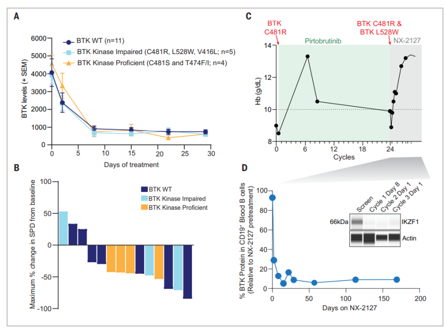 鉴于上述临床前数据,作者启动了NX-2127治疗复发/难治性B细胞恶性肿瘤(包括CLL)的首个人体I期临床试验。评估接受NX-2127治疗的患者外周血中BTK降解的动力学,发现NX-2127治疗后第8天观察到最大的降解,且BTK的降解与突变类型和酶活性水平无关A。另在14例可评估的CLL患者中的11例中,观察到靶病变的直径积(SPD)总和的改善B。在一名典型的患有BTK C481R突变的CLL男性患者先前接受了多种治疗,包括伊鲁替尼和维奈托克,随后接受了匹托鲁替尼治疗,并发生了BTK L528W突变,随后患者接受NX-2127治疗,血液学改善,贫血消退,脾肿大改善C。NX-2127治疗在CD19+ B细胞中导致>90%的BTK和大量的IKZF1降解D