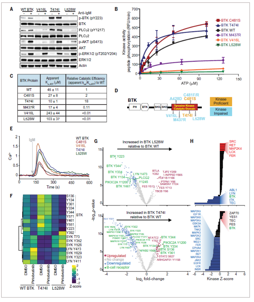 为了评估从内源性BTK位点表达的BTK在生理水平上的酶活性,作者产生了具有敲入BTK V416L、T474I和L528W突变的TMD8细胞(一种人BTK依赖的弥漫性大B细胞淋巴瘤细胞系)。对这一系列敲入细胞系的p-BTK Y223的评估显示,与BTK WT细胞相比,在抗免疫球蛋白m (IgM)存在或不存在BCR刺激的情况下,BTK V416L和L528W细胞系的p-BTK Y223明显降低,而BTK T474I细胞系中明显提高A。通过酶活性检测发现,BTK T474I突变体催化效率比WT提高了18倍,C481S为2倍,而其它突变体均较野生型较低 B-C。总的来说,我们对BTK酶活性的细胞和无细胞测量结果表明,BTK的耐药突变分为两种不同的类型: kinase proficient (T474I和C481S)和kinase impaired (M437R, V416L, L528W, C481F, C481Y和C481R) D。另作者还测量了钙离子(Ca2+)通量,这是一种在B细胞中依赖于BCR活性的途径。发现激酶受损(M437R, V416L,和L528W) BTK突变显示Ca2+通量较WT增加,尽管它们的催化活性大大降低E。磷酸化蛋白质组学显示,与WT相比,T474I突变细胞中确定的酪氨酸位点(Y223、Y461和Y551)中BTK的磷酸化增加,而l528w突变细胞中BTK的磷酸化减少F-G。通过激酶底物富集分析(KSEA)发现,L528W突变体特异性的MAPK(丝裂原活化蛋白激酶)和SRC家族中激酶的预测底物中酪氨酸磷酸化的上调H。这些数据提供了BTK激酶受损突变细胞中另一种信号机制的进一步证据。