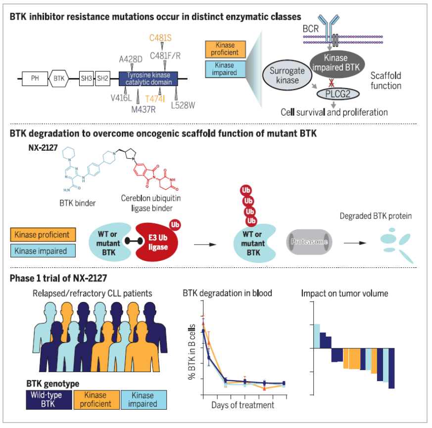 最近发现BTK突变可以使共价和非共价BTK抑制剂产生耐药性。在这项研究中,作者发现一组这些突变体包括两种类型:一类损害了BTK激酶活性,既Kinase impaired;另一类保留或者使激酶活性增强,既Kinase proficient(下图上);但不同的类型的突变均未改变下游BCR信号传导。因此,作者开始了解BTK的非酶功能,并探索靶向蛋白降解以克服突变BTK的致癌支架功能。这项工作包括评估在NX-2127(一种的BTK降解剂(NCT04830137)),通过蛋白酶体介导BTK的降解来达到中断BCR信号传导导致癌细胞增殖的结果(下图中),且在临床上进行了I期实验并达到了一个比较好的治疗结果(下图下)。