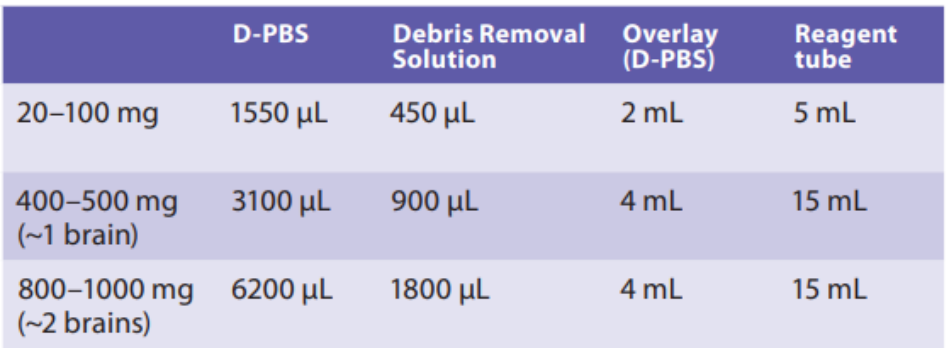 · 以下表格中的体积是针对20mg-1g组织(不超过 2 个成年小鼠脑组织)作为起始材料的细胞悬浮液。如果要处理较多脑组织,需要按照比例增加试剂用量和总体积量。