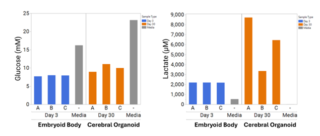 上图.3D脑类器官葡萄糖消耗与乳酸生成的测定:使用Glucose-Glo™和Lactate-Glo™检测试剂盒,分别在第3天(拟胚体阶段)和第30天(大脑类器官阶段)对个体3D脑类器官(A、B、C)培养液中的葡萄糖和乳酸水平进行检测。结果展示了代谢读数如何随时间推移捕捉葡萄糖消耗与乳酸生成的变化,为3D皮质脑类器官代谢监测提供了无损检测方案。